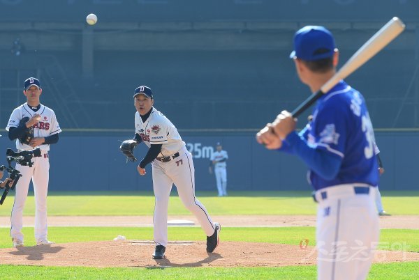 20일 서울 잠실야구장에서 열린 두산베어스 ‘곰들의 모임’ 환담회 및 최강야구와 연습 경기에 앞서 두산 이승엽 감독이 시구를 하고 있다.