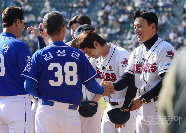 20일 서울 잠실야구장에서 열린 두산베어스 ‘곰들의 모임’ 환담회 및 최강야구와 연습 경기에 앞서 두산 이승엽 감독과 최강야구 김성근 감독이 인사하고 있다.
