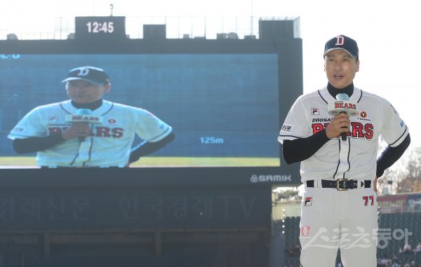 20일 서울 잠실야구장에서 열린 두산베어스 ‘곰들의 모임’ 환담회 및 최강야구와 연습 경기에 앞서 두산 이승엽 감독이 팬들에게 인사말을 하고 있다.