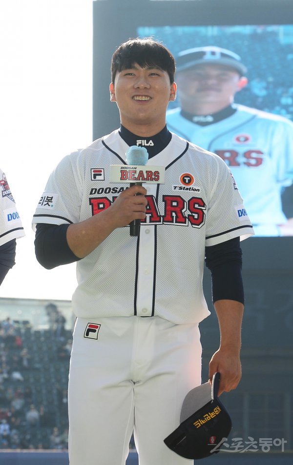 20일 서울 잠실야구장에서 열린 두산베어스 ‘곰들의 모임’ 환담회 및 최강야구와 연습 경기에 앞서 두산 윤준호가 팬들에게 인사하고 있다.
