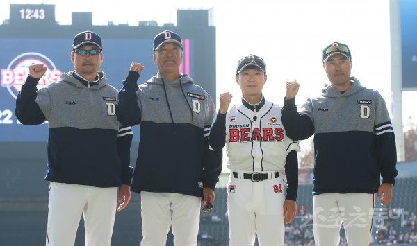 20일 서울 잠실야구장에서 열린 두산베어스 ‘곰들의 모임’ 환담회 및 최강야구와 연습 경기에 앞서 두산 김한수, 고토, 정수성, 조성환 코치가 기념 촬영을 하고 있다.