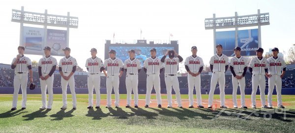 20일 서울 잠실야구장에서 열린 두산베어스 ‘곰들의 모임’ 환담회 및 최강야구와 연습 경기에 앞서 두산 신인 선수들이 인사말을 하고 있다.