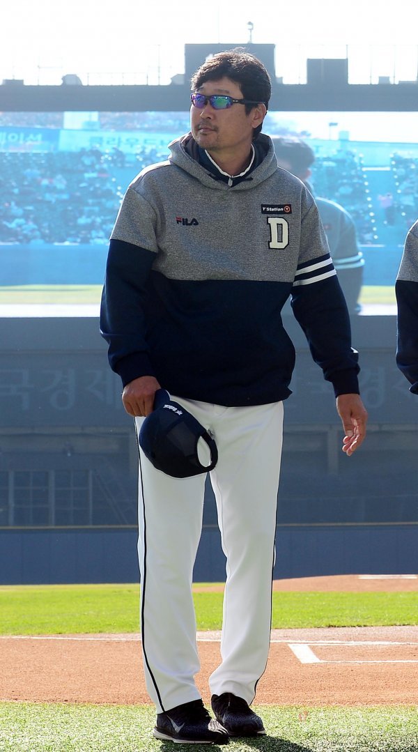 20일 서울 잠실야구장에서 열린 두산베어스 ‘곰들의 모임’ 환담회 및 최강야구와 연습 경기에 앞서 두산 김한수 코치가 팬들에게 인사하고 있다.