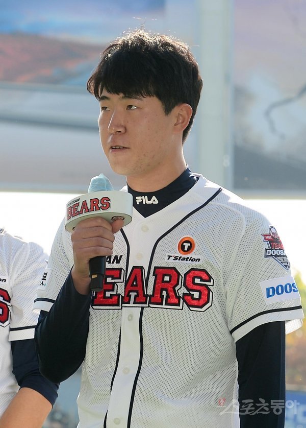 20일 서울 잠실야구장에서 열린 두산베어스 ‘곰들의 모임’ 환담회 및 최강야구와 연습 경기에 앞서 두산 김유성이 팬들에게 인사하고 있다.