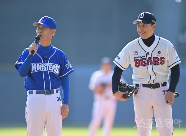 20일 서울 잠실야구장에서 열린 두산베어스 ‘곰들의 모임’ 환담회 및 최강야구와 연습 경기에 앞서 최강야구 김성근 감독이 시타 전 인사말을 하고 있다.