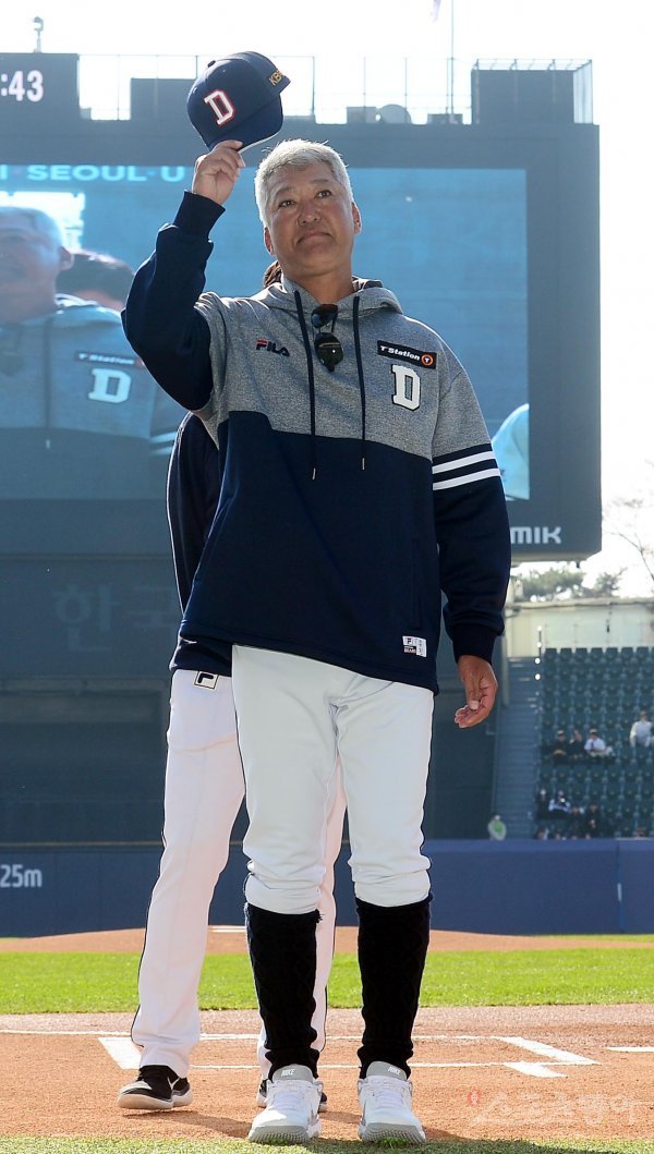 20일 서울 잠실야구장에서 열린 두산베어스 ‘곰들의 모임’ 환담회 및 최강야구와 연습 경기에 앞서 두산 고토 코치가 팬들에게 인사하고 있다.