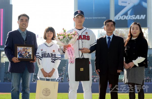 20일 서울 잠실야구장에서 열린 두산베어스 ‘곰들의 모임’ 환담회 및 최강야구와 연습 경기에 앞서 베사모 시상식에서 두산 김명신이 특별 수훈상을 수상해 기념 촬영을 하고 있다.