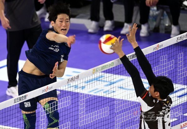 20일 인천 계양체육관에서 ‘2022-2023 도드람 V리그’ 인천 대한항공과 안산 OK금융그룹의 남자부 경기가 열렸다. 대한항공 김민재가 OK금융그룹의 블로커를 피해 공격을 펼치고 있다.