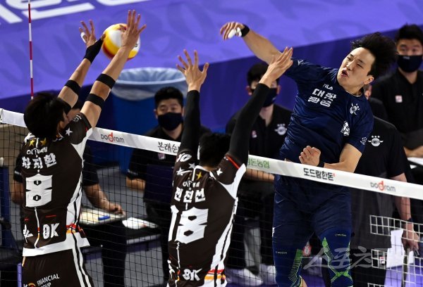 20일 인천 계양체육관에서 ‘2022-2023 도드람 V리그’ 인천 대한항공과 안산 OK금융그룹의 남자부 경기가 열렸다. 대한항공 임동혁 OK금융그룹의 블로커를 피해 스파이크를 날리고 있다.