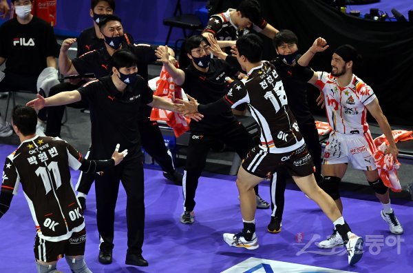 20일 인천 계양체육관에서 ‘2022-2023 도드람 V리그’ 인천 대한항공과 안산 OK금융그룹의 남자부 경기가 열렸다. OK금융그룹 석진욱 감독이 득점을 올린 선수를 환영하고 있다.