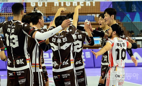 20일 인천 계양체육관에서 ‘2022-2023 도드람 V리그’ 인천 대한항공과 안산 OK금융그룹의 남자부 경기가 열렸다. OK금융그룹이 대한항공을 상대로 세트스코어 3-2로 승리한 후 코트에서 기쁨을 나누고 있다.