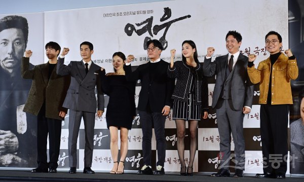 배우 이현우, 배정남, 박진주, 윤제균 감독, 김고은, 정성화, 조재윤이 21일 서울 용산구 CGV용산아이파크몰점에서 열린 영화 ‘영웅’ 제작보고회에서 포즈를 취하고 있다.