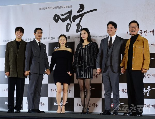 배우 이현우, 배정남, 박진주, 김고은, 정성화, 조재윤이 21일 서울 용산구 CGV용산아이파크몰점에서 열린 영화 ‘영웅’ 제작보고회에서 포즈를 취하고 있다.