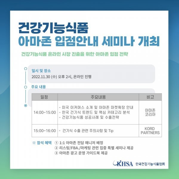 세미나 참가 기업에는 아마존 입점 관련 1대1 전담 매니저가 배정되고, 리스팅, FBA, 마케팅 관련 소규모 집중 세미나 참가 기회와 아마존 광고 운영 가이드북 등 추가 혜택이 제공된다. 건기식협회 회원사라면 누구나 신청할 수 있고, 25일까지 협회 홈페이지에서 접수하면 된다.
