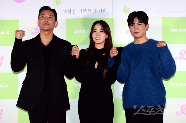 21일 서울 광진구 롯데시네마 건대입구에서 영화 ‘요정’ 언론시사회가 열렸다. 배우 김주헌, 류현경, 김신비가 카메라를 향해 포즈를 취하고 있다.