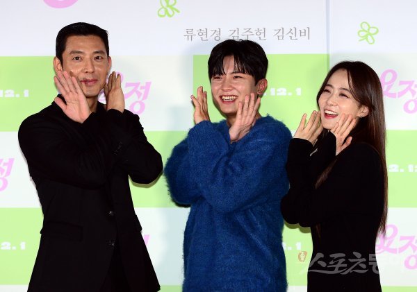 21일 서울 광진구 롯데시네마 건대입구에서 영화 ‘요정’ 언론시사회가 열렸다. 배우 김주헌, 김신비, 류현경이 카메라를 향해 포즈를 취하고 있다.