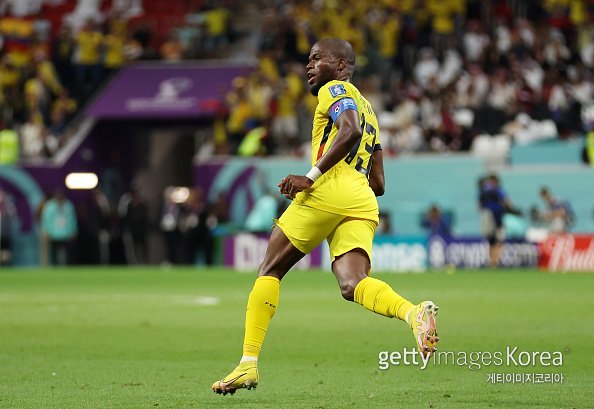 발렌시아는 21일(한국시간) 카타르 알코르 알바이트 스타디움에서 열린 개최국 카타르와 조별리그 A조 1차전에서 2골을 터트리며 에콰도르의 2-0 승리를 이끌었다. 경기 시작 3분 만에 넣은 자신의 골이 이번 대회에 도입된 반자동 오프사이드 판독기술(SAOT)에 의해 노골로 번복됐다. 하지만 전반 16분 자신이 얻은 페널티킥(PK)을 성공시킨 뒤 전반 31분에는 앙헬로 프레시아도(24·헹크)의 크로스를 헤더로 연결해 다시 골문을 열었다. 2014년 브라질대회 네이마르(30·파리 생제르맹), 2018년 러시아대회 데니스 체리셰프(32·베네치아)에 이은 3개 대회 연속 개막전 멀티골이라는 진기록도 수립했다.