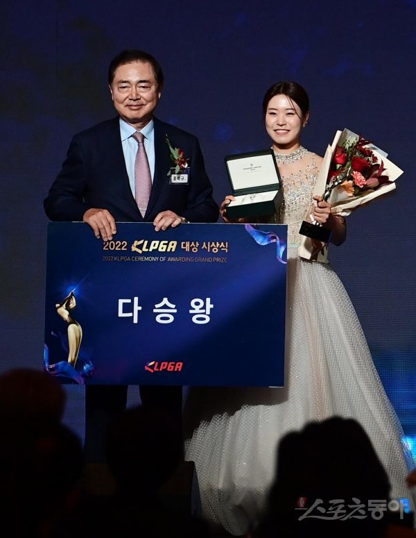 21일 서울 강남구 삼성동 그랜드인터컨티넨탈 서울파르나스에서 열린 ‘2022 KLPGA 대상 시상식’에서 프로골퍼 박민지가 다승왕을 수상해 홍석규 전임회장과 기념 촬영을 하고 있다.