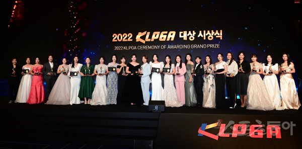 21일 서울 강남구 삼성동 그랜드인터컨티넨탈 서울파르나스에서 열린 ‘2022 KLPGA 대상 시상식’에서 대상 김수지, 상금왕 박민지, 신인왕 이예원을 비롯한 수상자들이 기념 촬영을 하고 있다.