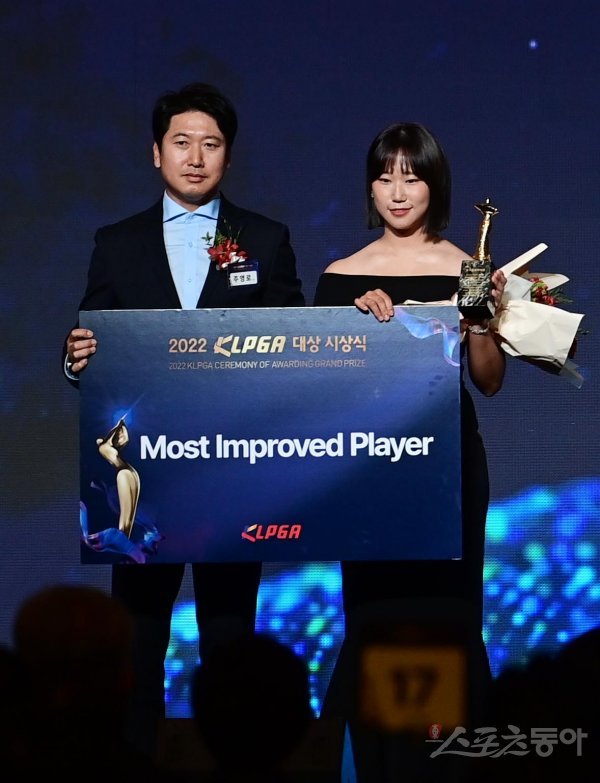 21일 서울 강남구 삼성동 그랜드인터컨티넨탈 서울파르나스에서 열린 ‘2022 KLPGA 대상 시상식’에서 정윤지가 MOST IMPROVED PLAYER AWARD를 수상해 기념 촬영을 하고 있다.