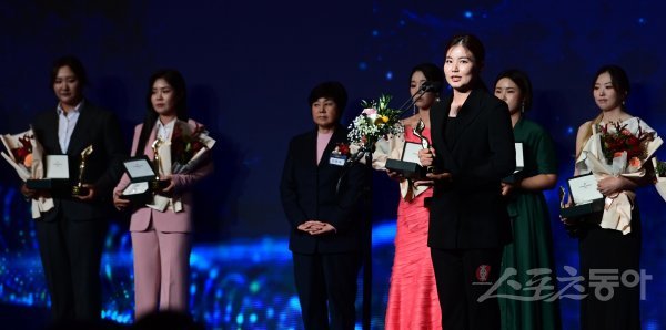 21일 서울 강남구 삼성동 그랜드인터컨티넨탈 서울파르나스에서 열린 ‘2022 KLPGA 대상 시상식’에서 국내 특별상을 수상한 장수연이 대표로 소감을 말하고 있다.