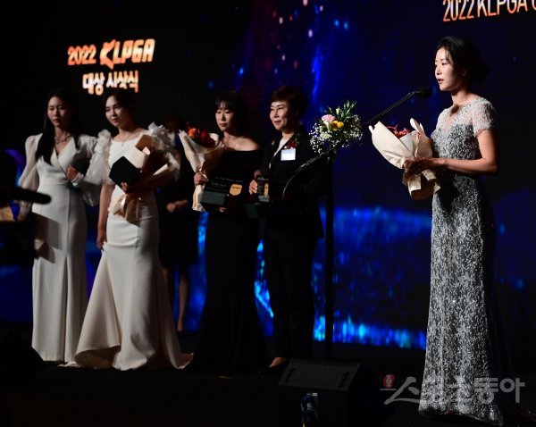 21일 서울 강남구 삼성동 그랜드인터컨티넨탈 서울파르나스에서 열린 ‘2022 KLPGA 대상 시상식’에서 위너스클럽에 등록된 유효주가 대표로 소감을 말하고 있다.