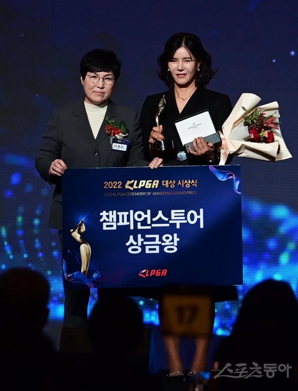 21일 서울 강남구 삼성동 그랜드인터컨티넨탈 서울파르나스에서 열린 ‘2022 KLPGA 대상 시상식’에서 챔피언스투어 상금왕을 수상한 김선미가 이영미 부회장과 기념 촬영을 하고 있다.