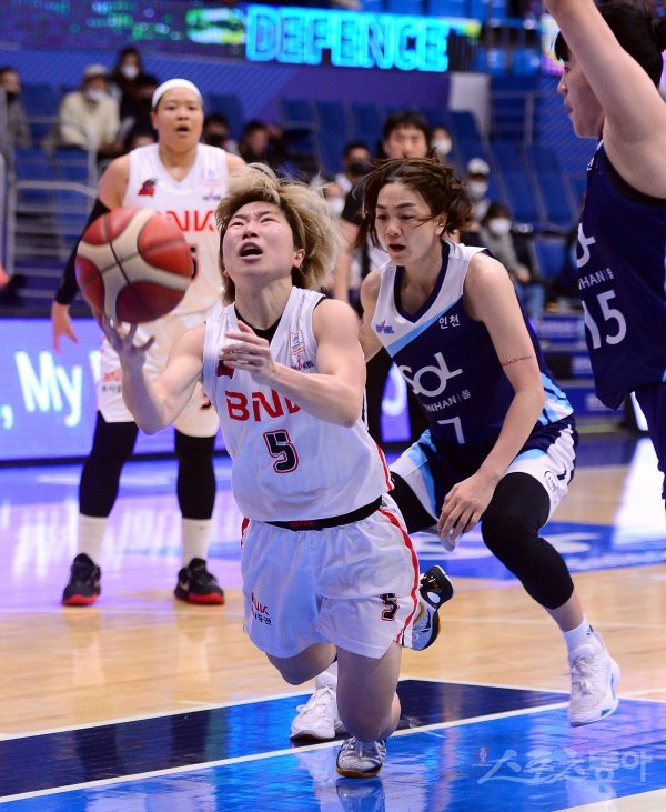 21일 인천 도원체육관에서 열린 ‘신한은행 SOL 2022~2023 여자프로농구’는 ‘ 인천 신한은행과 부산 BNK 썸 경기에서 BNK 썸 안혜지가 넘어지며 슛을 던지고 있다.