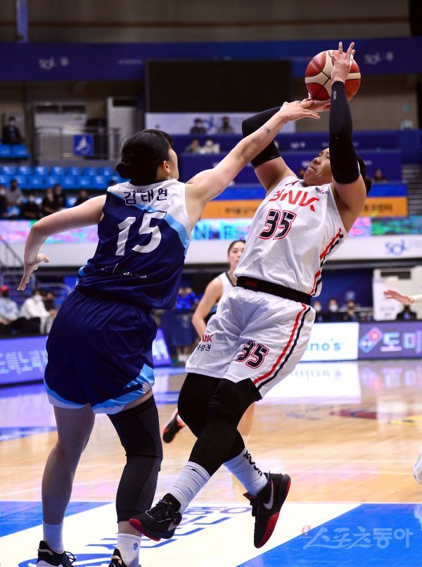 21일 인천 도원체육관에서 열린 ‘신한은행 SOL 2022~2023 여자프로농구’는 ‘ 인천 신한은행과 부산 BNK 썸 경기에서 BNK 썸 김한별이 신한은행의 수비를 뚫고 중거리 슛을 하고 있다.