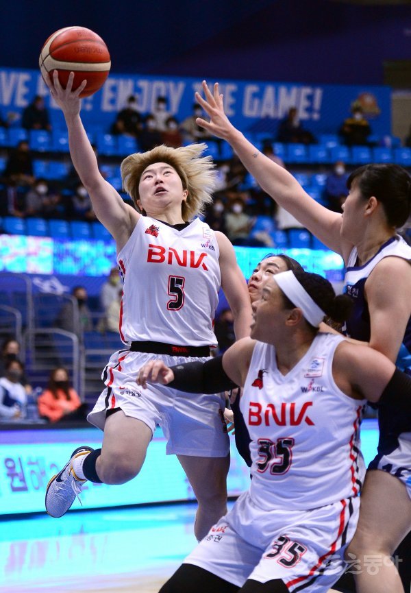 21일 인천 도원체육관에서 열린 ‘신한은행 SOL 2022~2023 여자프로농구’는 ‘ 인천 신한은행과 부산 BNK 썸 경기에서 BNK 썸 안혜지가 신한은행의 수비를 뚫고 골밑 슛을 하고 있다.