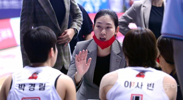 21일 인천 도원체육관에서 열린 ‘신한은행 SOL 2022~2023 여자프로농구’는 ‘ 인천 신한은행과 부산 BNK 썸 경기에서 BNK 썸 박정은 감독이 작전 지시를 하고 있다.