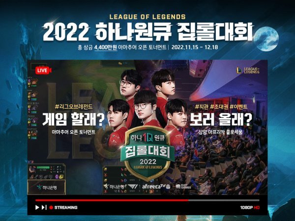 하나은행이 12월 18일까지 SK텔레콤 CST1과 함께 ‘하나원큐 집롤대회’를 개최한다.총 상금 4400만 원 규모의 리그오브레전드(LoL) 아마추어 오픈 토너먼트 대회가 메인 행사다. 5대5 협곡대전과 2대2 깐부대전 등 2개의 종목으로 진행하며, 4강전부터 서울 상암동 소재 e스포츠 전문 경기장인 아프리카 콜로세움에서 오프라인 유관중 경기로 열린다. 페이커(이상혁) 등 T1 소속 선수가 스페셜 게스트로 참여한다. 참가자 전원에게 5000 하나머니와 함께 추첨을 통해 T1 한정판 게임스킨을 증정한다.