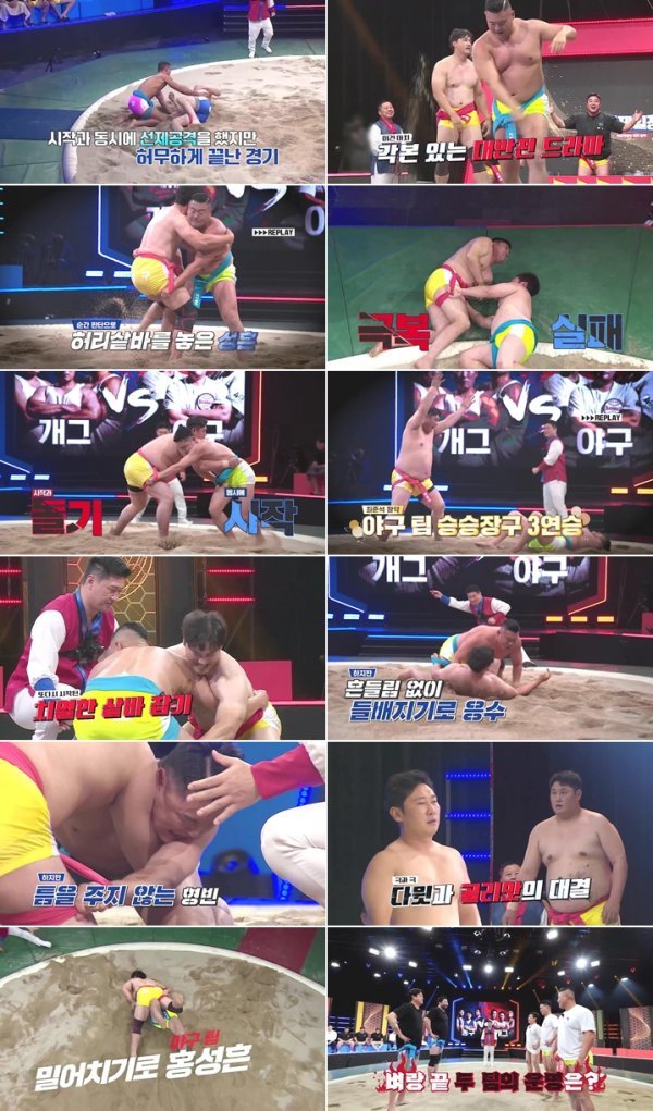 농구팀과 격투팀에 이어, 개그팀과 야구팀의 본선 토너먼트가 시작됐다. 모래판에 선 두 팀은 시작부터 거침없는 독설 릴레이로 긴장감을 폭발시켰다. 이어 미키광수와 홍성흔이 첫 번째 주자로 대면했다. 여기서 미키광수는 갑자기 홍성흔에게 다가가 이마에 머리를 맞대고 상대를 도발하는 퍼포먼스를 시도했다. 홍성흔도 미키광수에게 지지 않고 매서운 눈빛으로 맞섰다. 경기가 시작되자 미키광수는 홍성흔을 압박하며 샅바 싸움에서 우위를 점했지만, 홍성흔은 미키광수의 주특기 ‘배지기’ 기술의 방어 노하우를 활용해 짜릿한 1승을 따냈다.