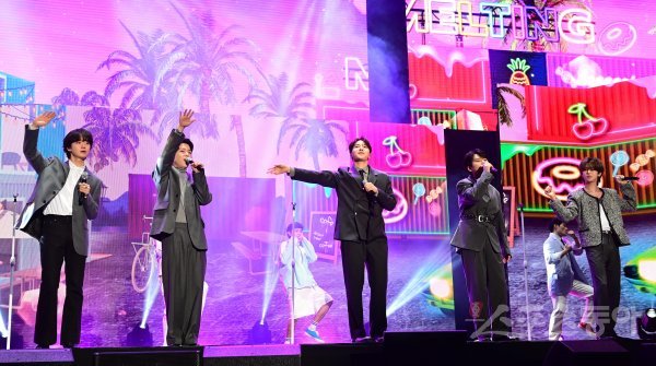 그룹 고막소년단이 22일 서울 강서구 화곡동 KBS아레나에서 열린 데뷔 쇼케이스에서 타이틀곡 ‘단거’ 무대를 펼치고 있다.