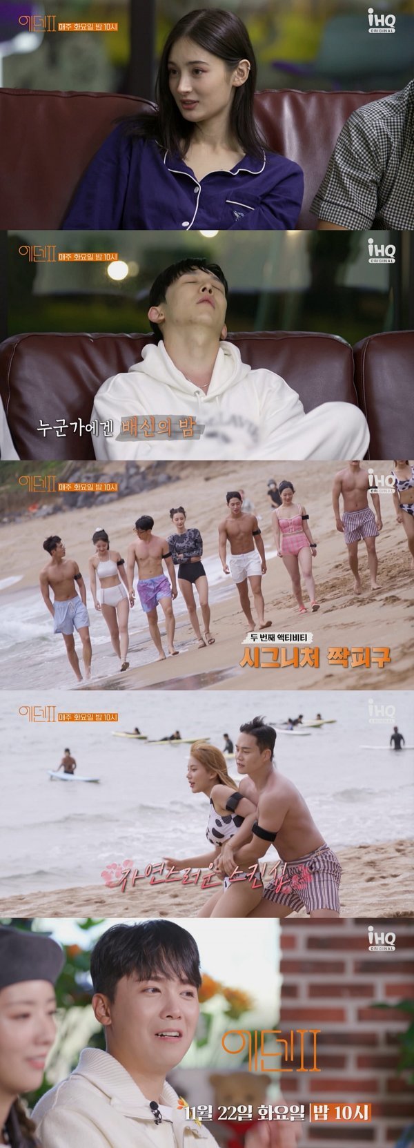 22일 오후 10시 방송되는 채널 IHQ 연애 리얼리티 '에덴2' 2회에서는 '에덴 하우스'에서 첫날밤을 보내는 청춘남녀 8인(김강래, 김도현, 김수민, 조이건, 라나, 손서아, 이서연, 현채희)의 모습이 전파를 탄다.