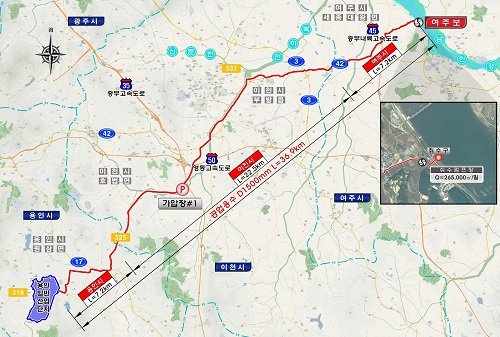 용인 반도체클러스터 공업용수는 여주시 남한강 여주보에서 취수해 이천시를 거쳐 총 36.9㎞에 이르는 관로(1500㎜)를 통해 일일 26만5000톤(1차분)이 공급될 예정이다.