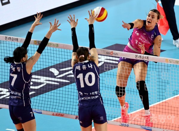 22일 경상북도 김천실내체육관에서 ‘2022-2023 도드람 V리그’ 김천 한국도로공사와 인천 흥국생명의 여자부 경기가 열렸다. 흥국생명 옐레나가 한국도로공사 블로커를 피해 스파이크를 날리고 있다.