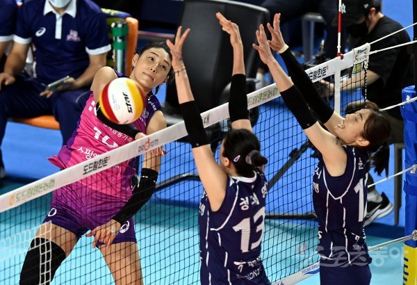 22일 경상북도 김천실내체육관에서 ‘2022-2023 도드람 V리그’ 김천 한국도로공사와 인천 흥국생명의 여자부 경기가 열렸다. 흥국생명 김연경이 한국도로공사 블로커를 피해 스파이크를 날리고 있다.