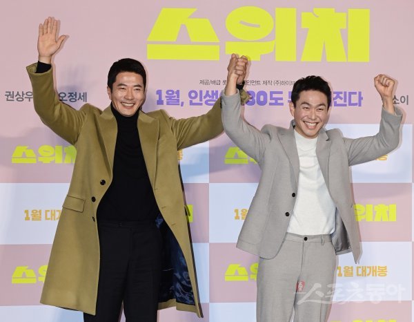 배우 권상우와 오정세가 23일 서울 광진구 자양동 롯데시네마 건대입구점에서 열린 영화 ‘스위치’ 제작보고회에서 포즈를 취하고 있다.