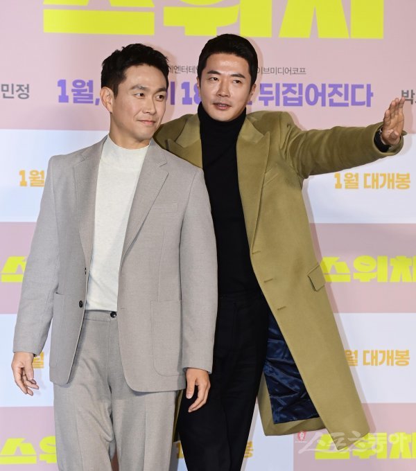 배우 오정세와 권상우가 23일 서울 광진구 자양동 롯데시네마 건대입구점에서 열린 영화 ‘스위치’ 제작보고회에서 포즈를 취하고 있다.