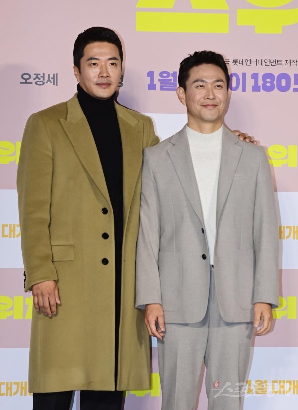 배우 권상우와 오정세가 23일 서울 광진구 자양동 롯데시네마 건대입구점에서 열린 영화 ‘스위치’ 제작보고회에서 포즈를 취하고 있다.