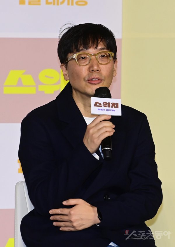 마대윤 감독이 23일 서울 광진구 자양동 롯데시네마 건대입구점에서 열린 영화 ‘스위치’ 제작보고회에서 인사말을 하고 있다.