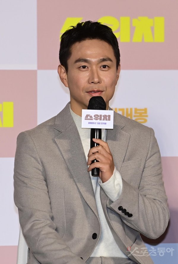배우 오정세가 23일 서울 광진구 자양동 롯데시네마 건대입구점에서 열린 영화 ‘스위치’ 제작보고회에서 인사말을 하고 있다.