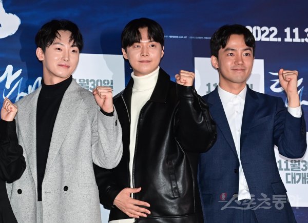 배우 하경, 임현수, 박지훈이 23일 서울 용산구 CGV용산아이파크몰점에서 열린 영화 ‘탄생‘ 언론시사회에서 포즈를 취하고 있다.