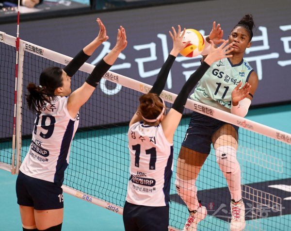 23일 서울 장충체육관에서 열린 ‘2022~2023 도드람 V-리그’ 여자부 GS칼텍스와 IBK기업은행 경기에서 GS칼텍스 모마가 IBK기업은행의 블로킹 사이로 스파이크를 날리고 있다.