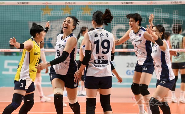 23일 서울 장충체육관에서 열린 ‘2022~2023 도드람 V-리그’ 여자부 GS칼텍스와 IBK기업은행 경기에서 세트스코어 3-1 승리를 거둔 IBK기업은행 선수들이 환호하고 있다.