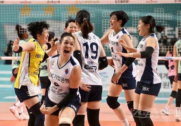 23일 서울 장충체육관에서 열린 ‘2022~2023 도드람 V-리그’ 여자부 GS칼텍스와 IBK기업은행 경기에서 세트스코어 3-1 승리를 거둔 IBK기업은행 선수들이 환호하고 있다.