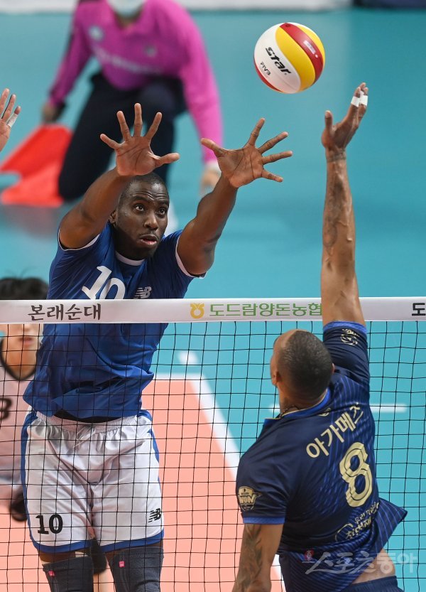 24일 서울 장충체육관에서 열린 ‘2022~2023 도드람 V-리그’ 남자부 우리카드와 현대캐피탈 경기에서 현대캐피탈 오레올이 블로킹을 시도하고 있다.