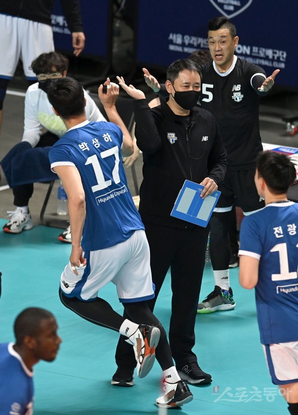 24일 서울 장충체육관에서 열린 ‘2022~2023 도드람 V-리그’ 남자부 우리카드와 현대캐피탈 경기에서 현대캐피탈 박상하가 블로킹 득점에 성공한 후 최태웅 감독고 기뻐하고 있다.