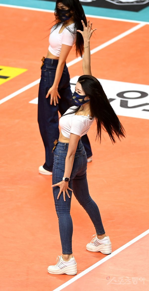 24일 서울 장충체육관에서 열린 ‘2022~2023 도드람 V-리그’ 남자부 우리카드와 현대캐피탈 경기에서 치어리더가 공연을 펼치고 있다.